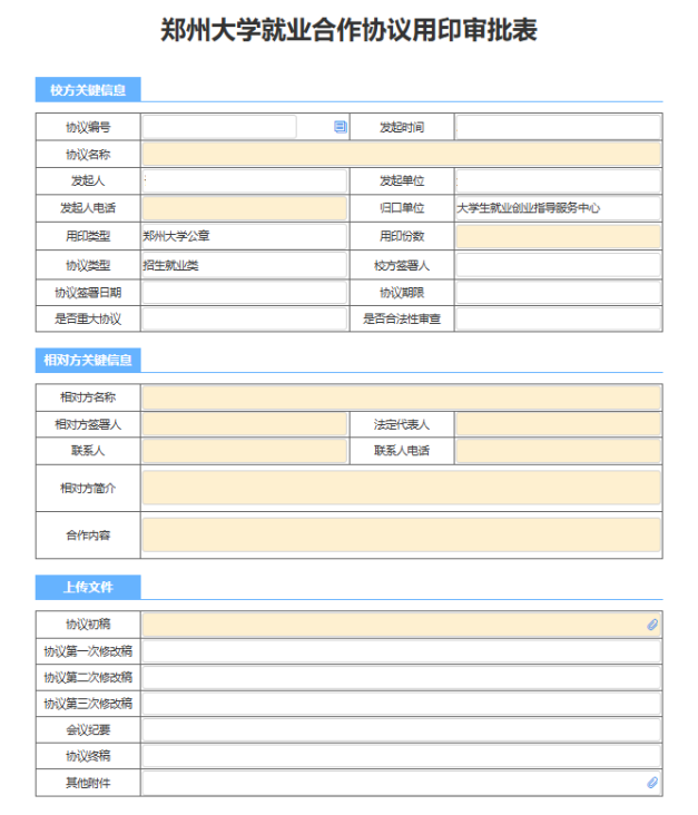 5.进入郑州大学就业合作协议用印审批流程后,发起人填写校方关键信息和相对方关键信息,并上传协议初稿和附件。