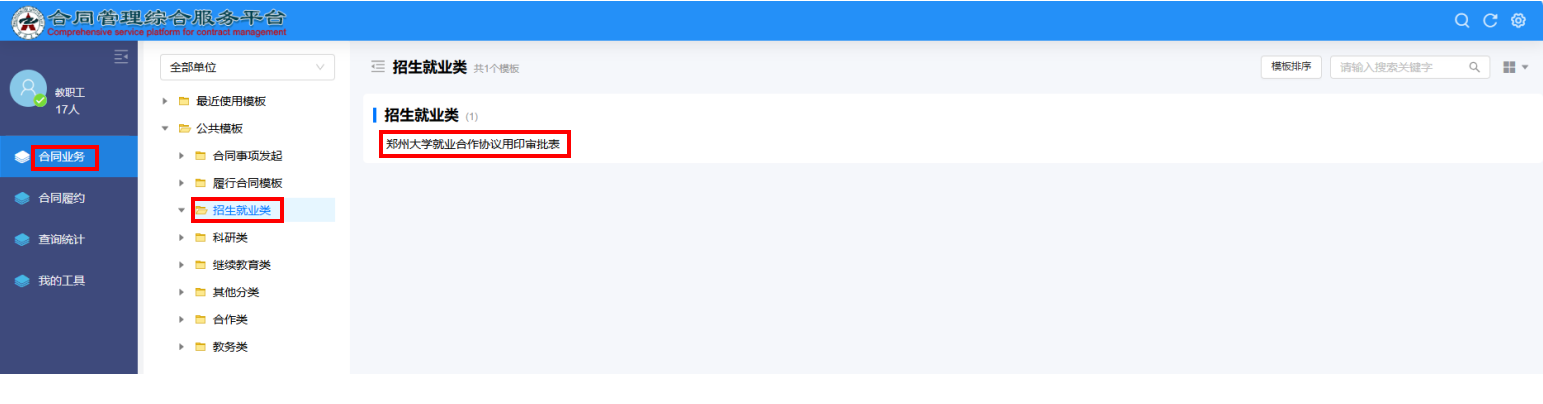 4.进入合同管理系统后,由合同业务—业务发起—公共模板—招生就业类—郑州大学就业合作协议用印审批表进入。