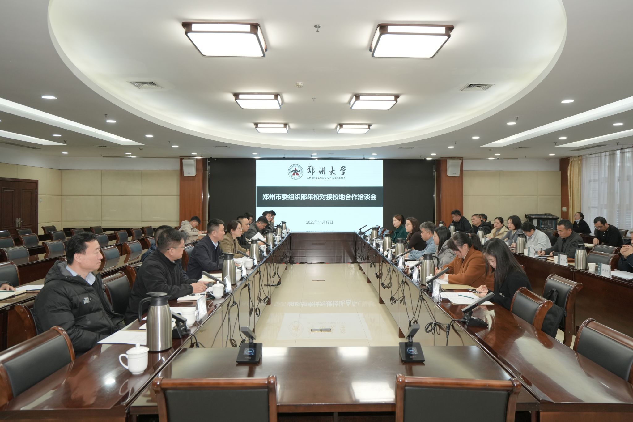 11月19日,郑州市委组织部来校对接洽谈校地合作。郑州市委组织部人才二处处长袁刘坤、郑州市部分区县人才办负责同志、企业代表,郑州大学规划与学科建设部部长吉慧芳、学校相关部门和学院负责同志参加会议。