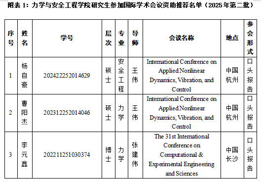 根据郑州大学《关于开展郑州大学研究生参加国际学术会议资助项目的通知》的文件精神,我院杨自豪等3位同学提出申请郑州大学研究生参加国际学术会议资助,遵循“研究生个人申请与导师推荐、培养单位审核、培养单位公示并提交备案”的工作方式与“公正、公平、公开”的原则,我院对申请人员及提交材料进行了严格审核,现将参加国际学术会议资助推荐人选予以公示,参见附表1。