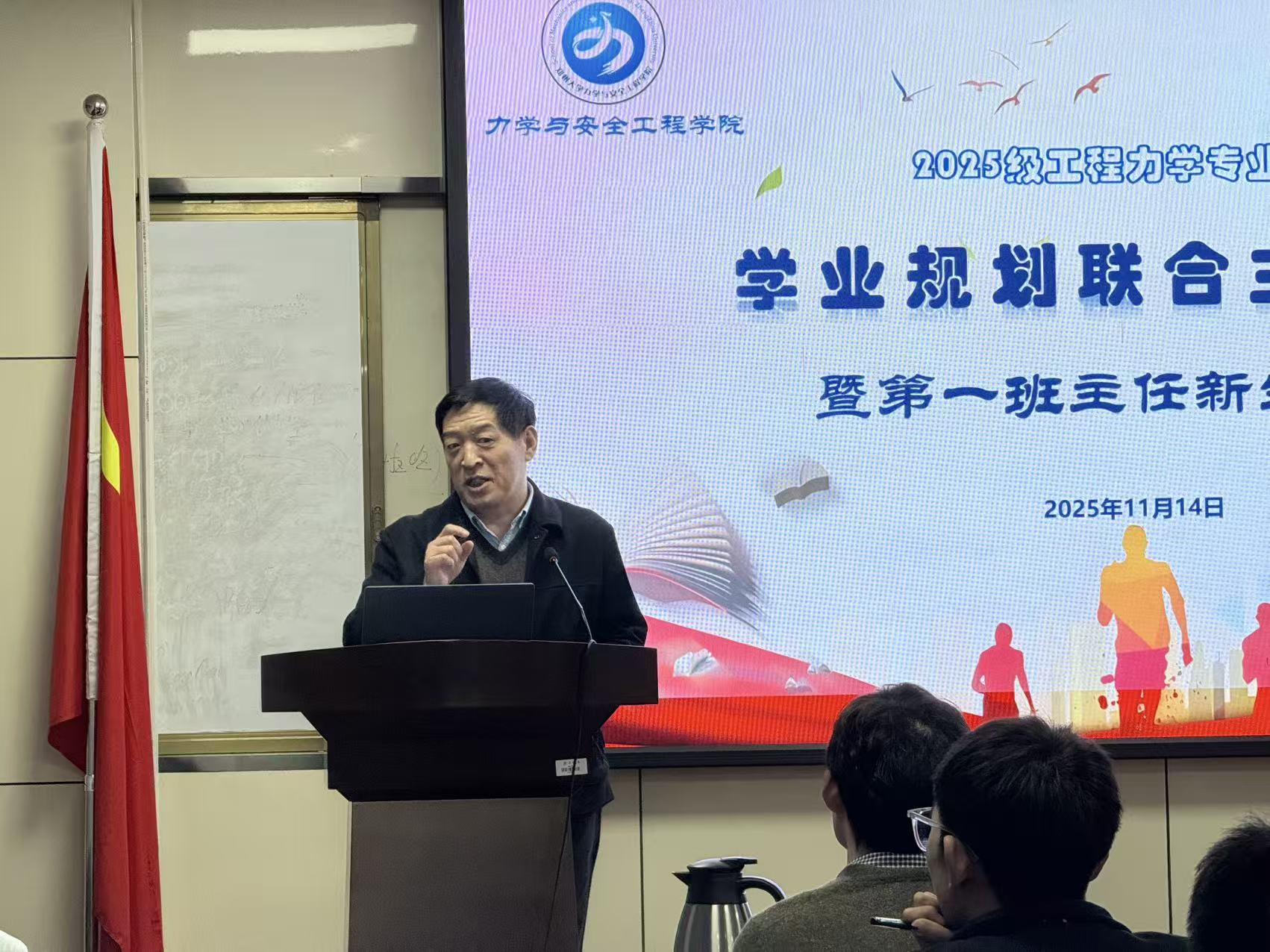 为促进新生班级间的交流融合,引导同学们科学规划大学生活,坚定专业信念,11月14日,“力”足当下,“安”启未来职业生涯主题教育系列班会第一期——2025级工力一班、工力二班联合班会在院办404会议室隆重举行。学院党委书记路坚、党委副书记桂玲玲、工力一班班班主任何尚文老师、工力二班班主任杨照锐老师、2025级辅导员姚霖霖莅临现场,与两个班级的全体同学共同参与了本次联合班会。