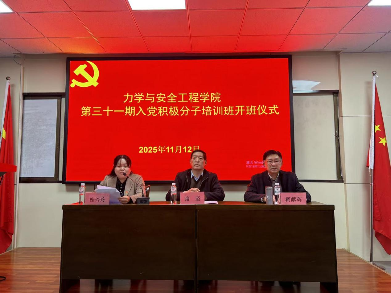 开班仪式在雄壮激昂的《中华人民共和国国歌》声中正式拉开帷幕。全体与会人员起立,齐声高唱,现场气氛庄重肃穆。仪式上,柯献辉同志宣读了《关于开办力学与安全工程学院第三十一期入党积极分子培训班的意见》,明确了本期培训班的指导思想、培训目标与总体安排;随后,团委书记蒋培培同志宣读了本期培训班各学习小组的人员名单及组长名单,明确了小组学习的组织形式;学生工作高级主管赵卓同志宣读了学员纪律要求,强调了培训期间的学习纪律、考勤制度与考核标准;学生工作主管吴盛杰同志则进一步明确了各组长的职责,要协助老师共同管理好本小组的学习活动。
