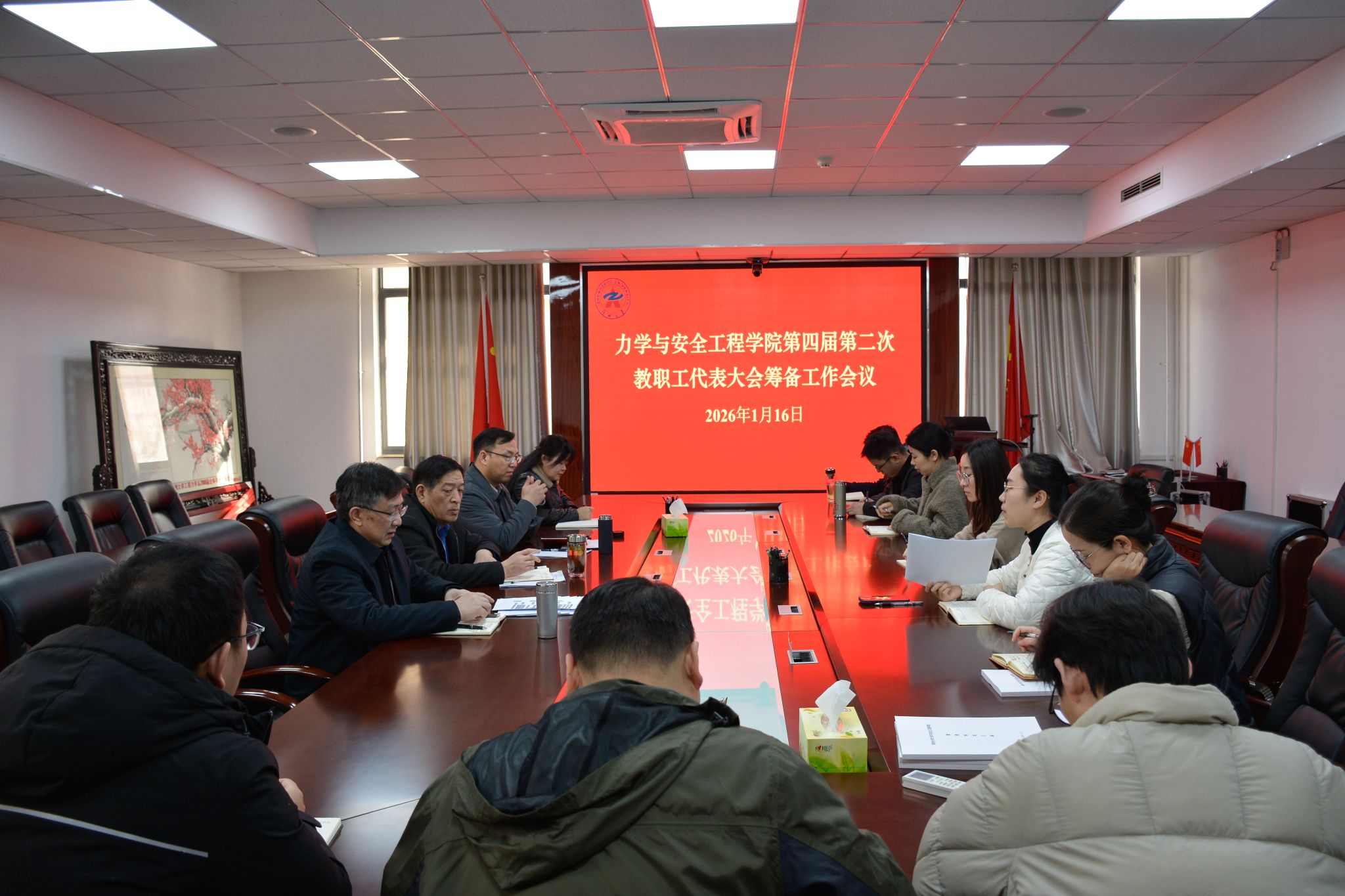 为保障学院第四届第二次教职工代表大会暨2025年度表彰大会顺利召开,明确任务分工、凝聚组织合力,2026年1月16日上午,力学与安全工程学院召开专项筹备工作会议。学院党委书记路坚,副院长张景伟(主持工作),党委副书记、纪委书记柯献辉,党委副书记桂玲玲参会,学院各教工党支部书记、系主任、工会委员、各年级辅导员等筹备工作相关人员参加会议。会议由学院工会主席蒋培培主持。