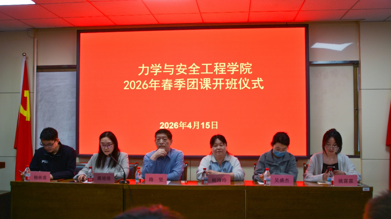 为深入学习贯彻党的二十届四中全会精神,加强团员青年的思想政治引领,全面提升团员综合素质,4月15日晚,力学与安全工程学院2026年春季团课开班仪式在学院四楼报告厅隆重举行。学院党委书记路坚、党委副书记桂玲玲及全体辅导员出席仪式,全体学员参加仪式,开班仪式由团委书记蒋培培主持。
