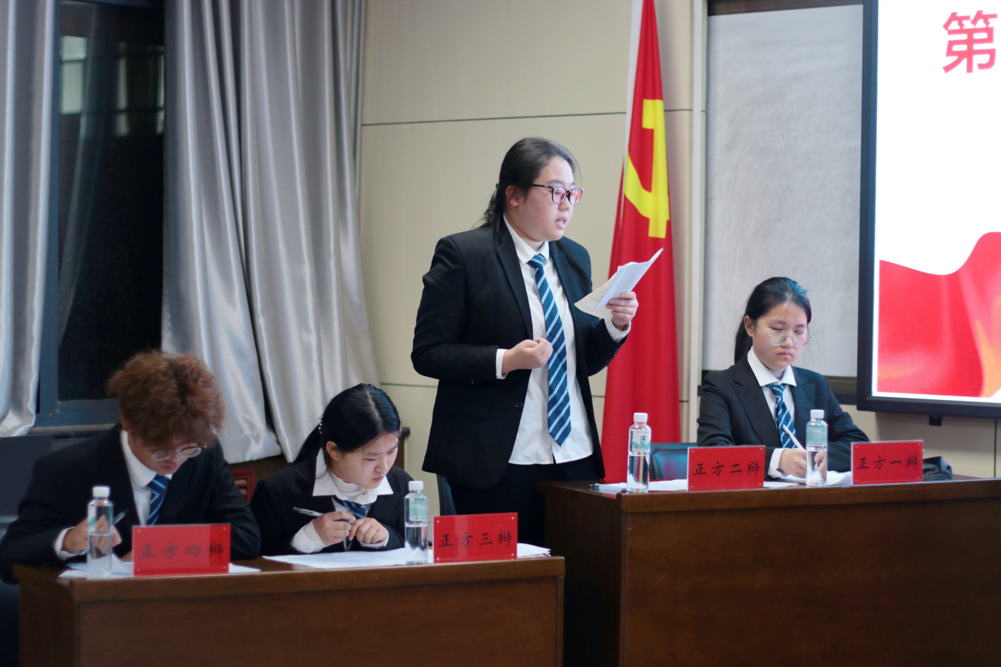 本次决赛特邀学院党委副书记桂玲玲老师,团委书记、2023级本科生辅导员蒋培培老师,2025级本科生辅导员姚霖霖老师,以及22级辩论队队长柏依淼、23级辩论队队长张红艳组成专业评委团,从立论条理、驳论攻防、论述升华等多个维度对比赛进行评判。