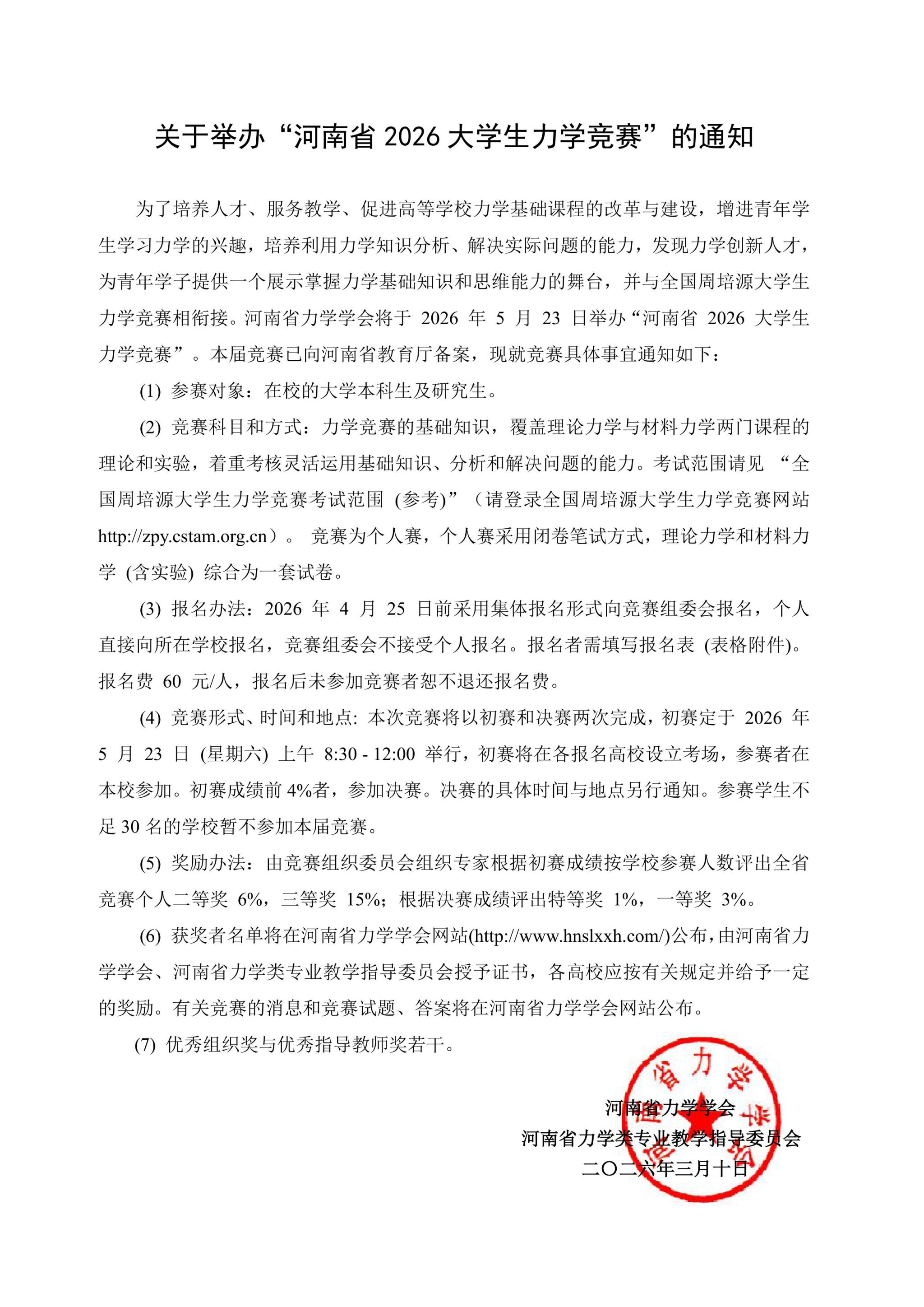 【公告】关于举办“河南省 2026 大学生力学竞赛”的通知