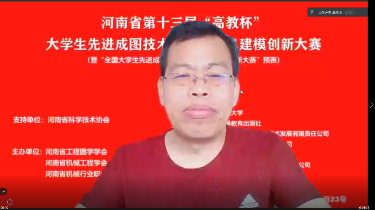 05月23日上午9:00以腾讯会议和会议直播的形式举行了开幕式。出席开幕式的领导有:河南省科学技术协会学会部部长王永钢,教育部高等学校工程图学课程教学指导分委员会委员、高等教育出版社首席编辑肖银玲,河南省机械工程学会秘书长李剑教授,河南省机械行业职业教育校企合作指导委员会秘书长、河南机电职业学院副校长王庆海教授,河南叁迪科技有限公司总经理王浩钢,河南维京电子科技有限公司马百敬总经理,河南省工程图学学会理事长张洛明。
