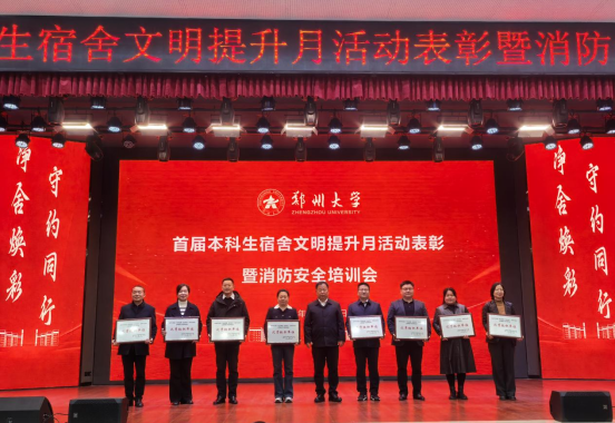 12月18日,郑州大学首届“净舍焕彩 守约同行”本科生宿舍文明提升月活动表彰大会暨消防安全培训会在主校区举行。会上对本次宿舍文明提升月中的先进集体进行表彰,共授予50个宿舍“卫生标兵宿舍”荣誉称号、40个宿舍“公约示范宿舍”荣誉称号、40个宿舍“创意样板宿舍”荣誉称号,16个单位“优秀组织奖”荣誉称号。