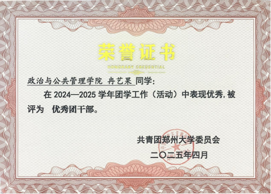 冉艺果,女,中共预备党员,郑州大学政治与公共管理学院2022级本科生,现已推免至武汉大学政治与公共管理学院国际政治系深造。现任年级团总支,曾任郑州大学政治与公共管理学院公共管理类5班班长、2022级副年级长。连续三年获得国家励志奖学金、一等奖学金、欧莱雅奖学金。荣获校“三好学生”“优秀学生干部”“优秀团干部”等荣誉。还曾在“挑战杯”大学生课外学术科技作品竞赛中获得省级二等奖,代表学校参与第二十届中国模拟联合国大会等。在政管院三年时光里,她以坚定的信念、踏实的步履,在学业、工作、实践与科研的多元舞台上,诠释着新时代青年党员的责任与担当,绽放出璀璨的先锋光芒。
