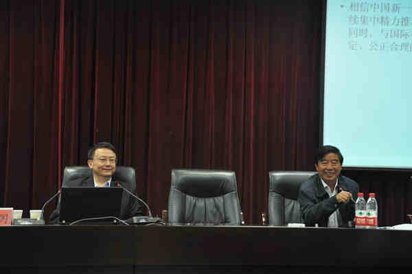 2014年10月中旬,北京大学国际关系学院院长、第十二届全国政协常委贾庆国教授在我院学术报告厅为师生做“新时期中国外交面临的挑战及应对思路”的学术报告,报告会由郑志龙院长主持,公共事业管理与政治学系主任、博士生导师余丽教授做会议总结。贾庆国教授在讲学期间,刘学民书记、郑志龙院长、秦国民、高卫星副院长分别出席有关活动。我院任俊英、石杰琳教授,马润凡、孙发锋副教授、张永超等教师,国际政治学、政治学理论与方法、科学社会主义与国际共产主义运动、中外政治制度等专业硕士研究生,公共事业管理与政治学等系本科生及来自我校其他院系的学生共同聆听了此次报告。
