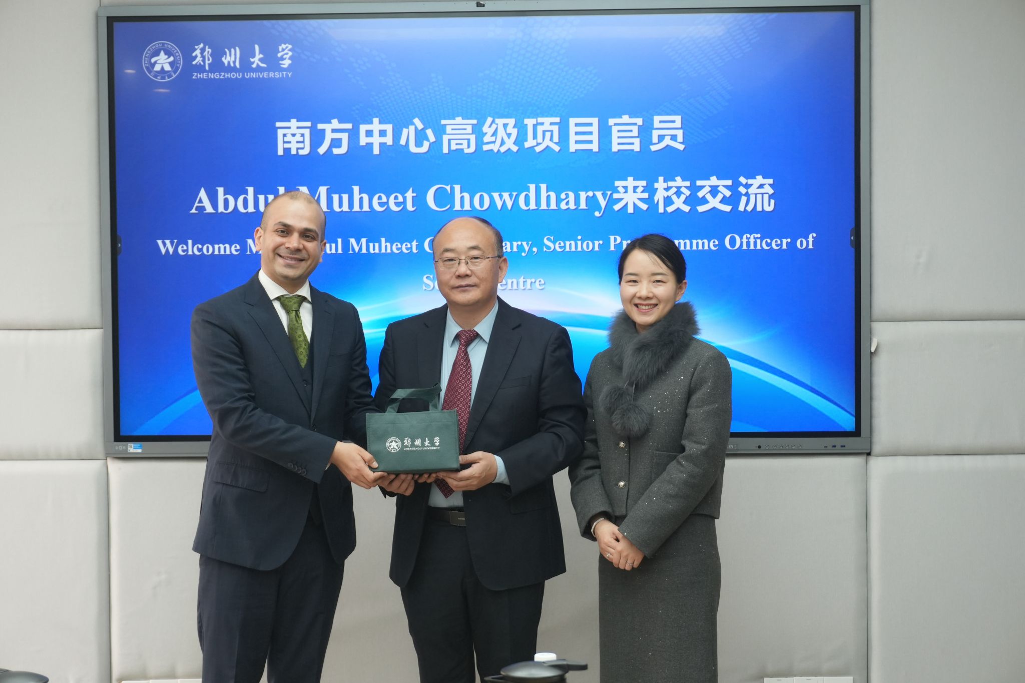 1月26日,南方中心(South Centre)高级项目官员阿卜杜勒·乔达里(Abdul Chowdhary)在我校校友康华茹博士陪同下到访郑州大学,国际交流与合作处处长吴军超及相关人员出席座谈会。