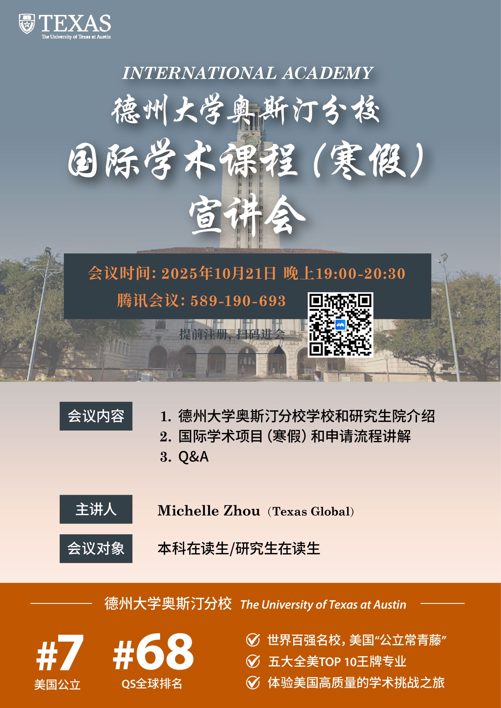 为进一步提高学生的国际视野,提升我校人才培养国际化水平,有效整合我校国际科研合作资源,现面向全校学生推出德州大学奥斯汀分校2026年寒假课程项目宣讲会,具体安排如下: