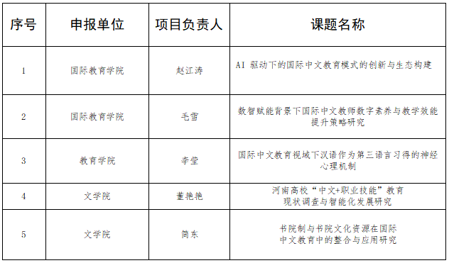2026年河南省国际中文教育研究与实践课题申报工作,经个人申请,单位审核推荐,学校组织评议,推荐赵江涛等5人入选项目,公示时间从2025年9月19日至9月26日(5个工作日),现将名单公布如下: