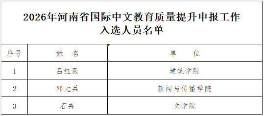 2026年河南省国际中文教育质量提升申报工作,经个人申请,单位审核推荐,推荐吕红医等3人入选项目,公示时间从2025年9月16日至9月23日(5个工作日),现将名单公布如下: