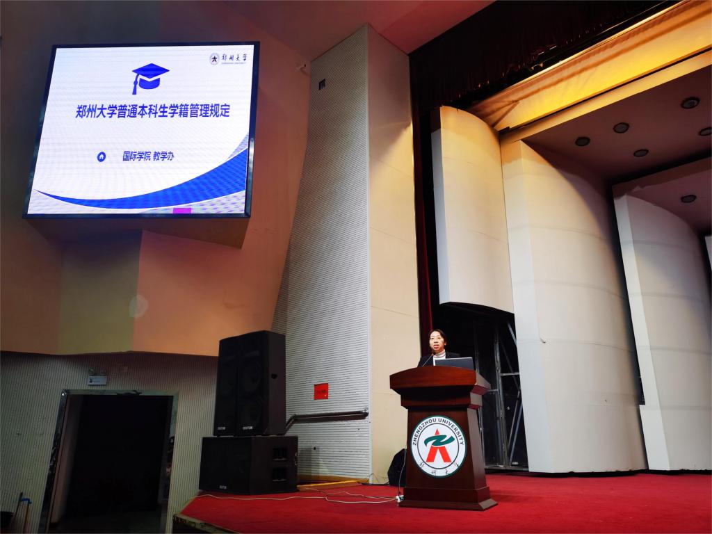 贾晓燕老师立足于《郑州大学普通本科生学籍管理规定》、《郑州大学授予学士学位规定》和《郑州大学考试违纪和作弊行为的认定与处理办法》三个文件,对学籍注册、考核与成绩记载、学业预警、毕业和学位授予,转专业、推优保研、交流访学和考试规则等方面的内容进行了详细讲解。同时,贾晓燕老师还结合我院的实际情况和具体案例,让新生充分了解学校的教学管理规定,帮助新生明确了大学期间的学习要求和行为规范的底线。