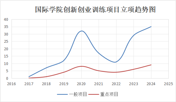 国际学院自2017年实施大学生创新创业训练计划项目以来,立项成果数量从最初的1项到今年的44项,其中重点项目累计高达37项,实现了跨越式的增长。2024年再次创历史新高,确定为重点项目的数量高达9项。