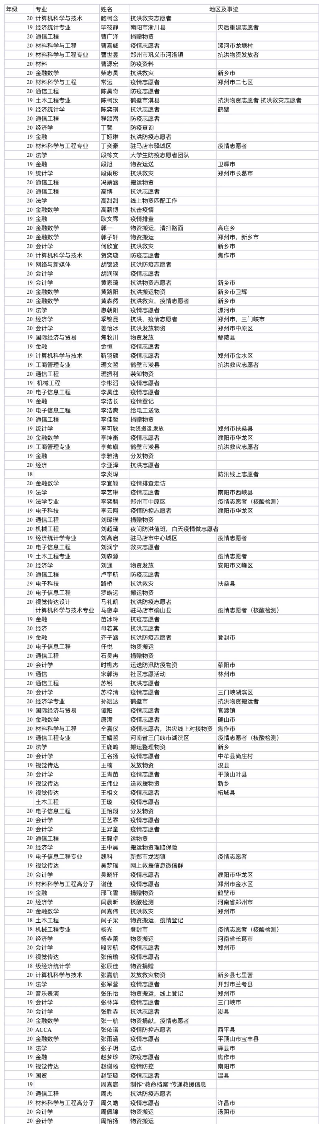 2020级计算机科学与技术专业的崔志昂,在防汛期间帮助平顶山义工运送救灾物资往新乡,参加“春雁行动”帮助社区清理洪水遗留垃圾,随后又响应社区号召作为小区志愿者,并为新乡灾区捐款。