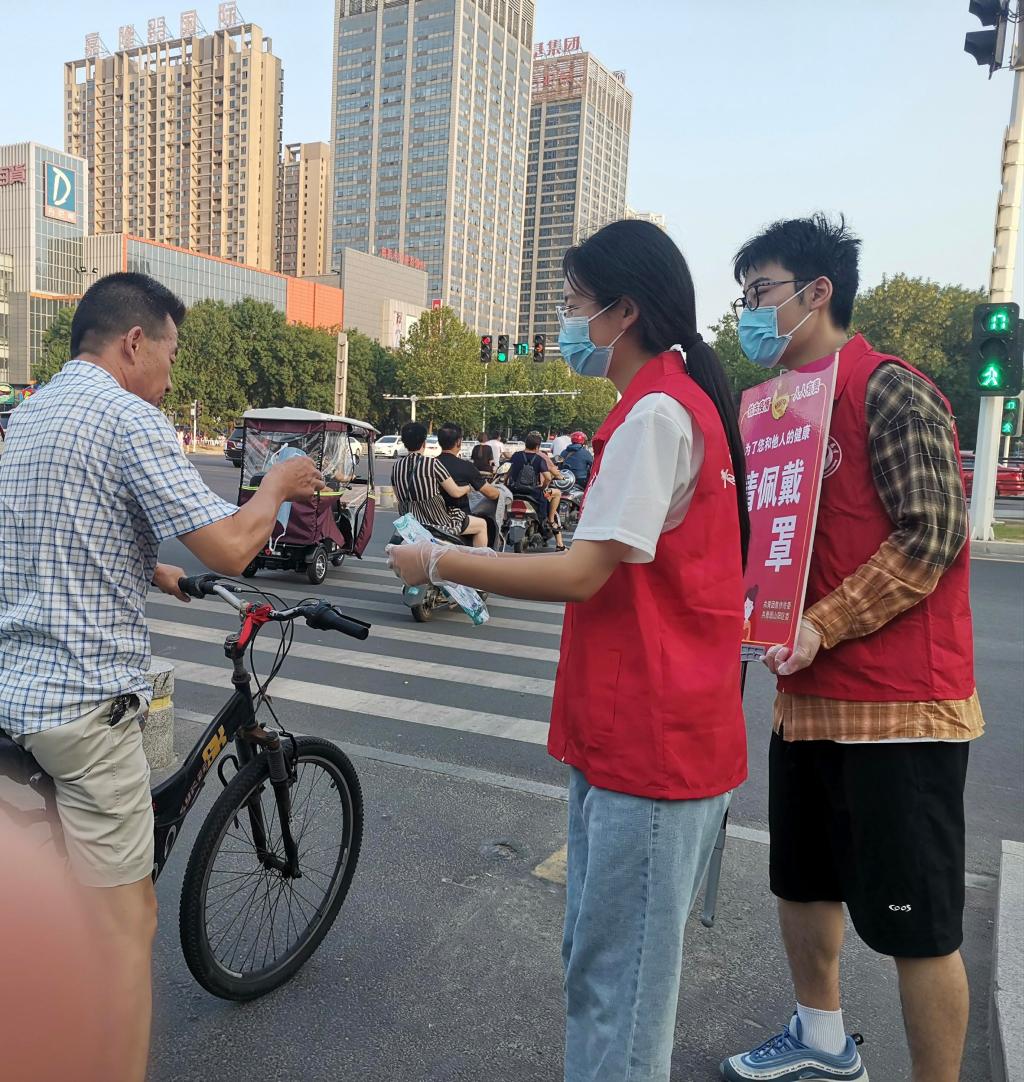 2020级材料科学与工程专业的仝嘉仪积极参与焦作市当地政府志愿活动,在路口提醒行人戴口罩,并为忘记戴口罩的行人免费发放口罩。在工作中她始终不曾倦怠,因为她深知这关乎着每一位居民的生命健康,做好居民健康的守门人就是她的责任。