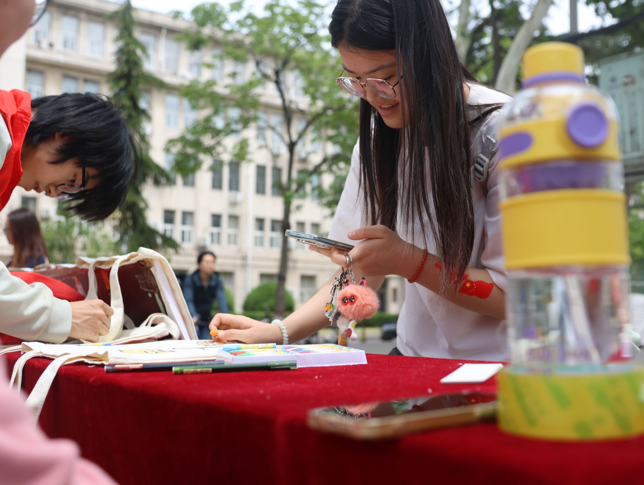 手作艺术区现场开放手作体验,零基础也能亲手创作五四专属纪念品。同学们围坐在一起,认真地描绘、粘贴,创作出一个个独具创意的五四专属纪念品。