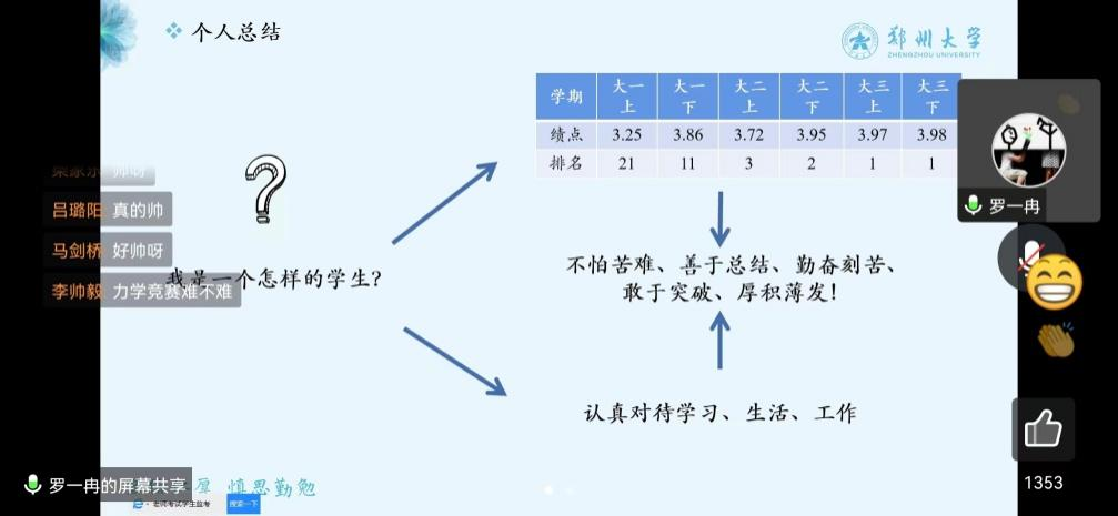 10月20日晚七点,郑州大学国际学院机械工程专业举办线上学习分享会。会议邀请机械与动力工程学院副院长陈江义教授、18级辅导员王奇帅老师和四名已保研考研的18、19级学生分享学习经验,交流学习心得,为疫情影响之下学生的学习生活答疑解惑,会议由陈江义院长主持进行。