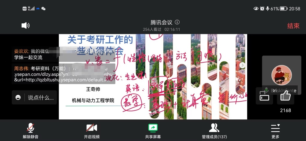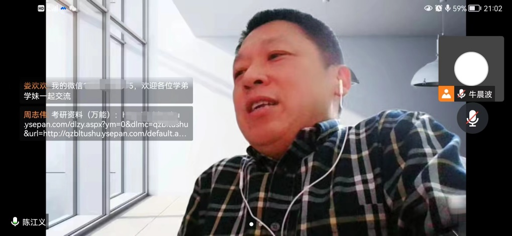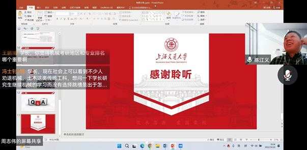 会议伊始,同学们纷纷点赞互动,热情欢迎陈江义院长、王奇帅老师和四名机械优秀学子。陈院长简要介绍参会成员和会议流程后,首先由考研至北京理工大学的杨佳沁同学和上海交通大学的周志伟同学分享考研学习干货、自身考研经验和对于考研科目的学习经验,与在线学生积极互动,认真答疑。