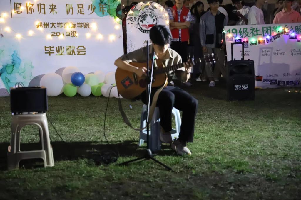 为迎接毕业季到来,5月31日,郑州大学国际学院大学生社团管理中心联合国际学院我爱木吉他社、国际学院梦幻摄影协会,于郑州大学南校区操场举行毕业歌会活动。