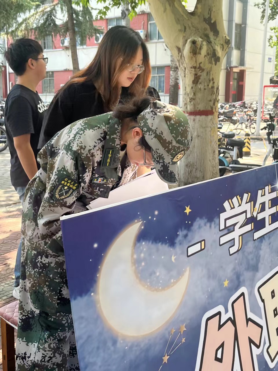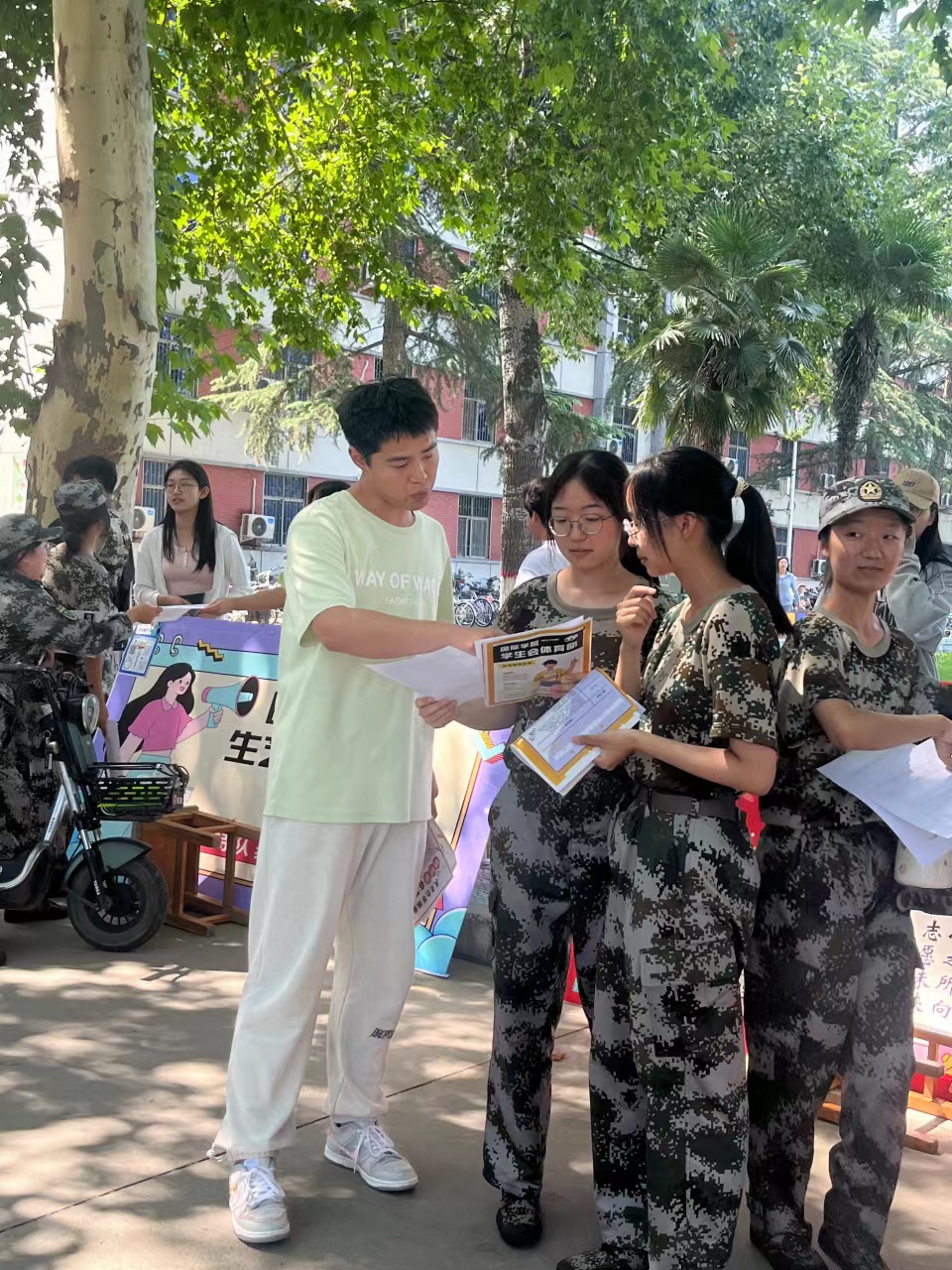 在学院的统一部署下,团委、学生会和大学生社团管理中心各部门在14号楼前林荫大道两侧布置宣传展板,帮助新生对各部门进行初步的了解。大量23级新生在军训训练结束后来到活动现场咨询了解,学生干事对所提及的问题进行了耐心解答,并介绍部门工作内容和往期精彩活动。招新过程中,各位新生根据自己的兴趣爱好和自身优势选择部门并填写报名表,同时各部门成员进行了认真的记录,做好报名登记工作。后续我院将统一安排时间对报名新生进行面试选拔。