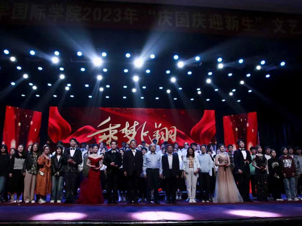 为迎接国庆节,欢迎2023级新生,国际学院于9月27日晚7点在南校区学习堂举办2023年“庆国庆 迎新生”晚会。国际学院党委书记李华峰、院长陈思坤、党委副书记赵强、院长助理王丽峰出席本次迎新晚会。国际学院教职工、2023级全体新生观看演出。