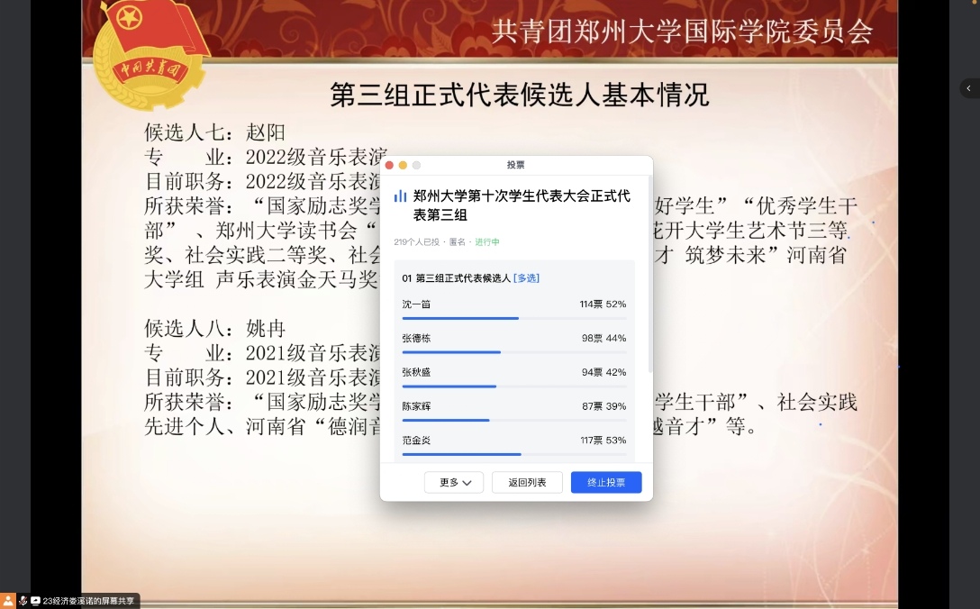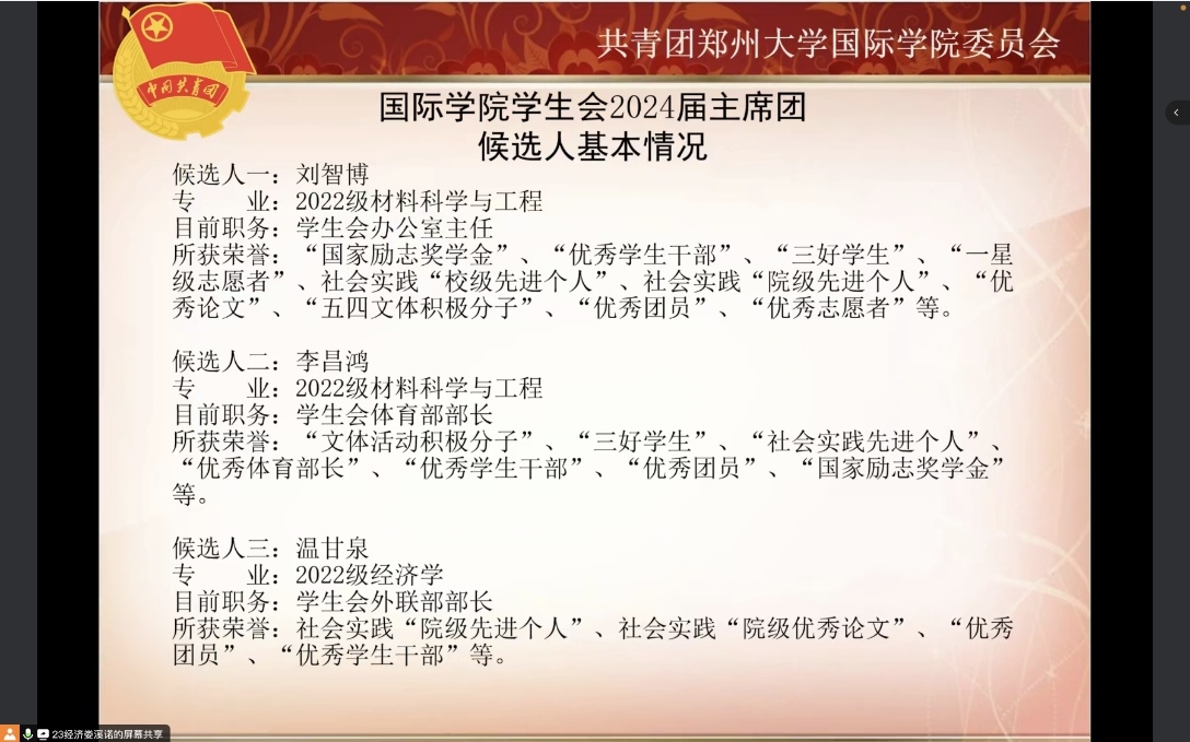 大会在庄严的国歌声中隆重开幕。大会依次听取并审议通过了学生会主席团成员王若涵同学代表国际学院2023届学生委员会做的工作报告、学生会主席团成员李帆做的资格审查报告以及学生会主席团成员张译文宣读的选举办法。随后,大会本着“民主、公开、公正”的原则,采用无记名投票的方式差额选举产生了国际学院2024届学生会主席团和郑州大学第十次学生代表大会正式代表32人,团委副书记郭鸽宣布名单。最后,团委书记郜蕾致闭幕词。她向学生代表提出期望和要求,号召学生提升自我、担当责任,为学院发展贡献力量。