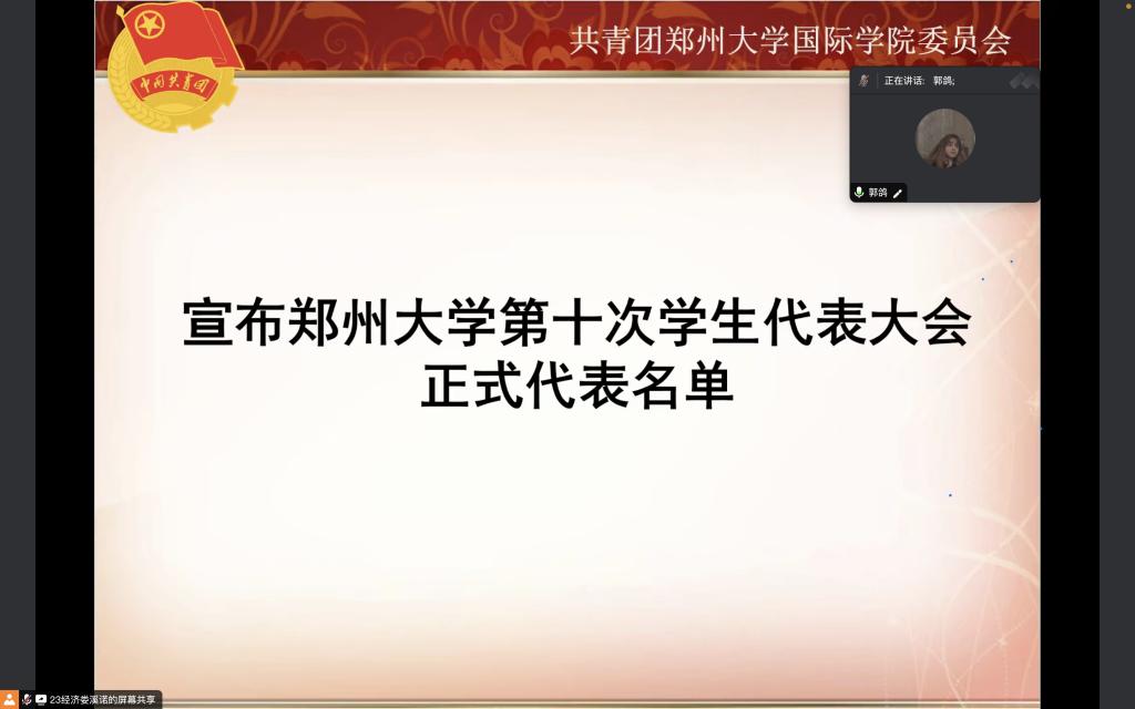 为加强学生组织建设,强化学生责任意识和担当精神,经认真筹备,国际学院于6月28日下午举行了第十一次学生代表大会。大会以线上方式举行,国际学院团委书记郜蕾、团委副书记郭鸽出席了本次大会,国际学院各专业学生代表320人参加了大会。