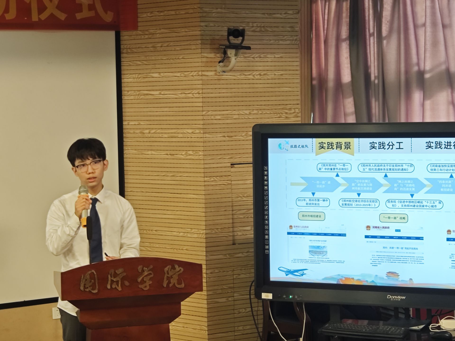 图5. “‘丝路共频,枢纽全球’:‘一带一路’倡议下内陆城市发展枢纽经济的路径探究”团队代表周海龙同学发言