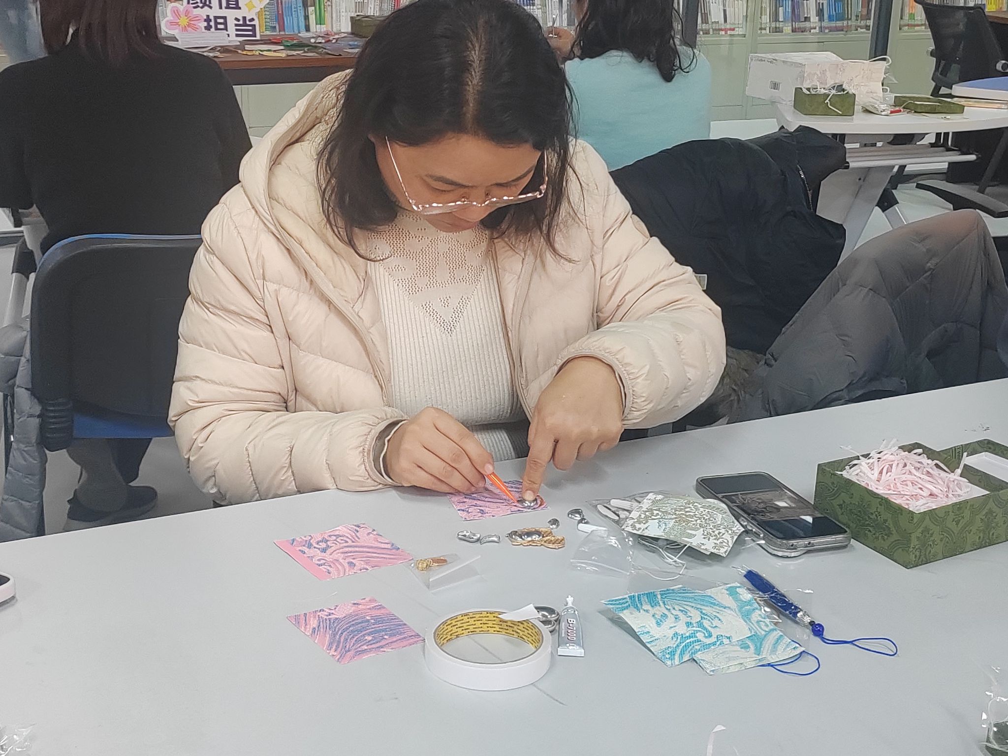 活动现场,专业手工老师详细讲解了宋锦的历史渊源和工艺特点,并从色彩搭配、固定技巧等方面予以指导。女教工们带着饱满的热情投入创作,指尖翻飞中,宋锦的华贵质感与珠绣的灵动光泽相互映衬,凝聚着大家的巧思与匠心,现场气氛温馨而热烈。