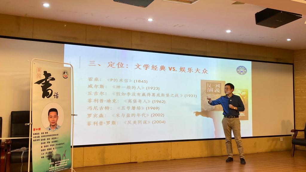 本次读书会邀请了上海外国语大学李锋教授为学院师生进行讲座。李锋教授以“漫谈中美文学的架空历史小说”为主题,为大家分享了麦家的《暗算》、胡适的《中国的文艺复兴》、以及毛姆的《巨匠与杰作》等图书。随后,李教授从历史学家研究历史的角度,辨析了架空历史和或然历史的区别与联系,详尽地讲述了架空历史小说这一文学形式。他引经据典,推荐并分享了众多相关题材的优秀作品和优秀作家。李教授从或然历史小说的三个必然条件谈到了架空历史小说的后现代叙事性,从早期的或然历史作品谈到了架空历史小说的三个选材母题,从中美两国架空历史文学作品的异同启迪大家从文学中反思历史与人生。本次讲座既兼顾了知识性、又极富趣味性。李教授渊博的学识、儒雅的气质和生动的讲解,极大地激发了大家阅读文学著作的热情和学习兴趣。