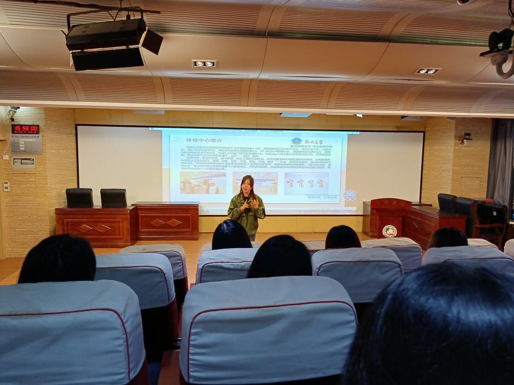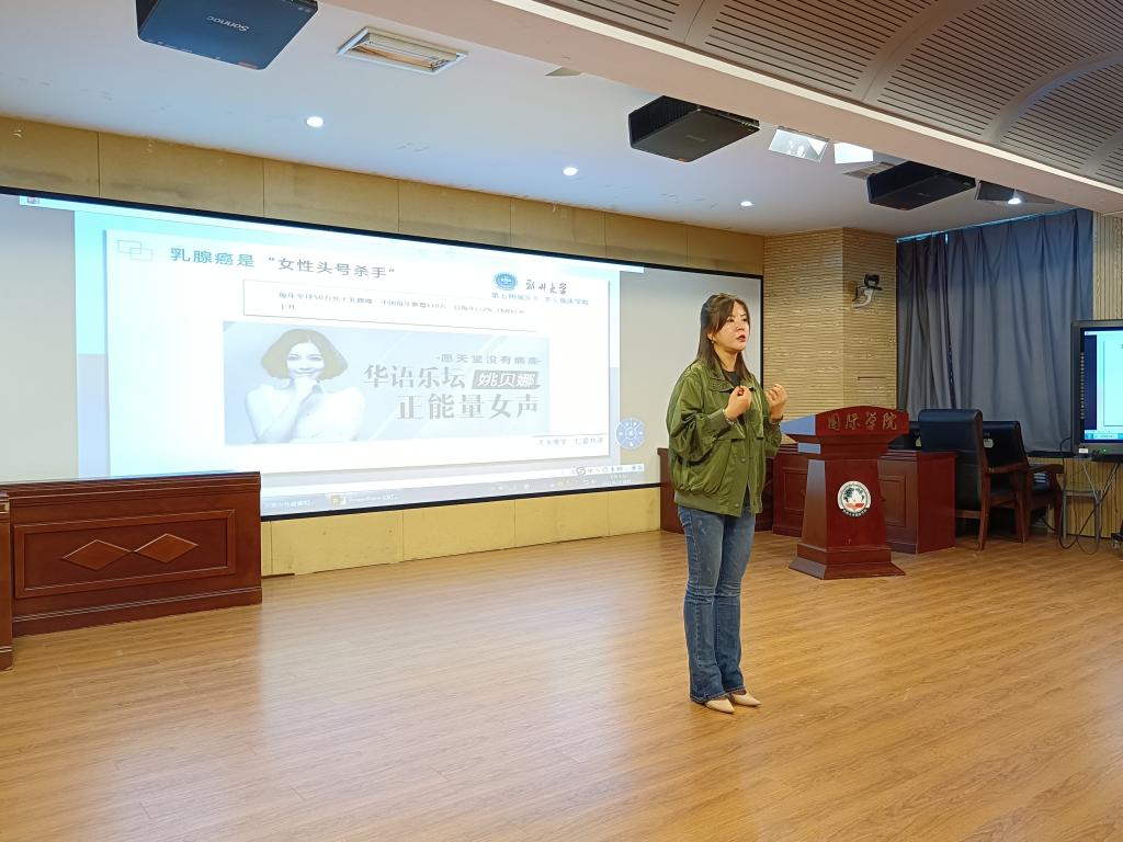 国际学院工会邀请郑州大学第五附属医院体检中心主任、副主任医师胡倩女士讲授健康管理策略。胡倩围绕现代女性乳腺、子宫、衰老三方面容易存在健康问题,结合饮食、营养、心态等治疗手段,提出了女性健康管理的策略。胡倩指出,美丽是每个女人都关注的问题,而美丽的前提是必须有健康的身体,拥有健康最有效的方式是保持良好的心态,均衡的饮食,规律的作息和适当的运动,并且要坚持每年定期体检,及时发现问题,及时解决问题。