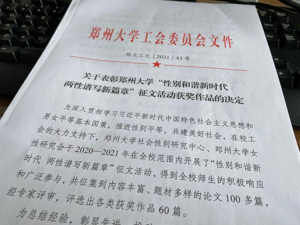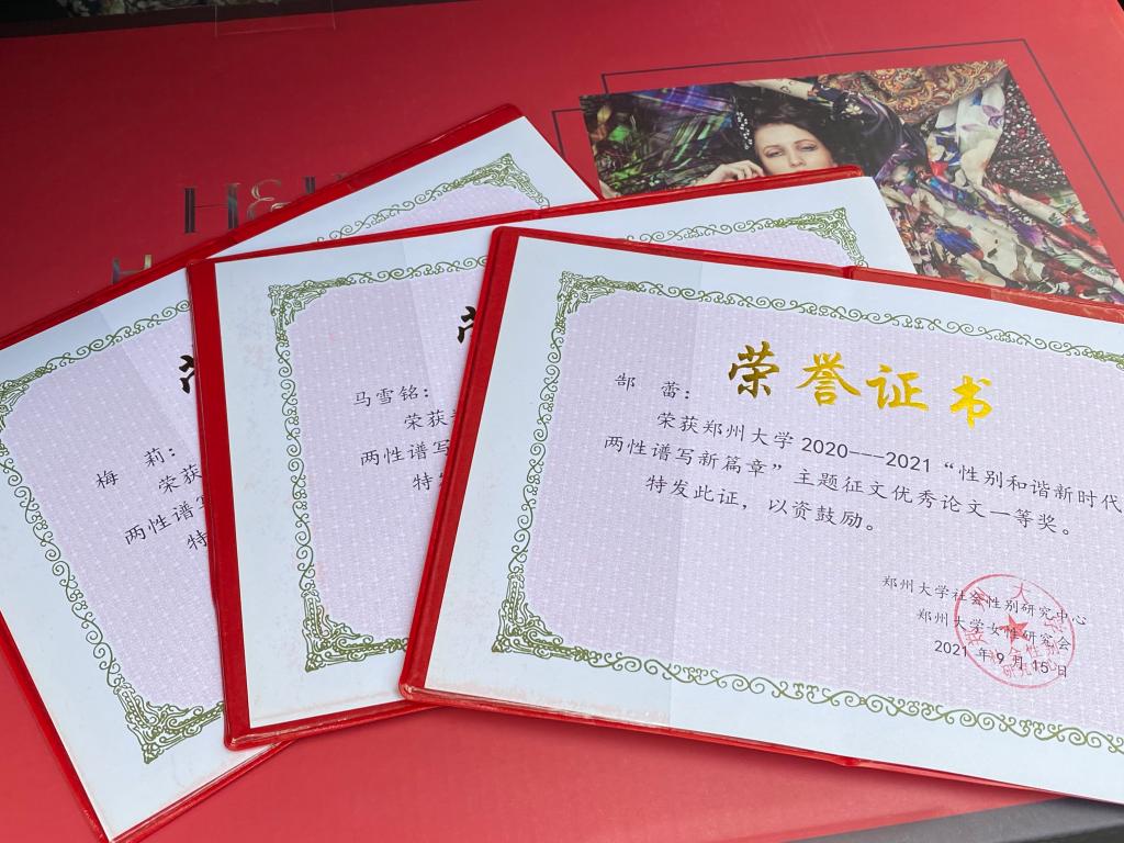 在2020—2021年郑州大学举办的“性别和谐新时代 两性谱写新篇章”征文活动中,国际学院教职工踊跃参与,并荣获多个奖项。郜蕾的《新冠肺炎疫情防控中女性发挥的中坚力量研究》获教工组一等奖,梅莉的《新时代两性平等参与经济社会发展研究》获教工组二等奖,马雪铭《美人在骨不在皮——让女性真正得到尊重》获教工组三等奖。