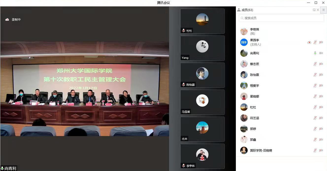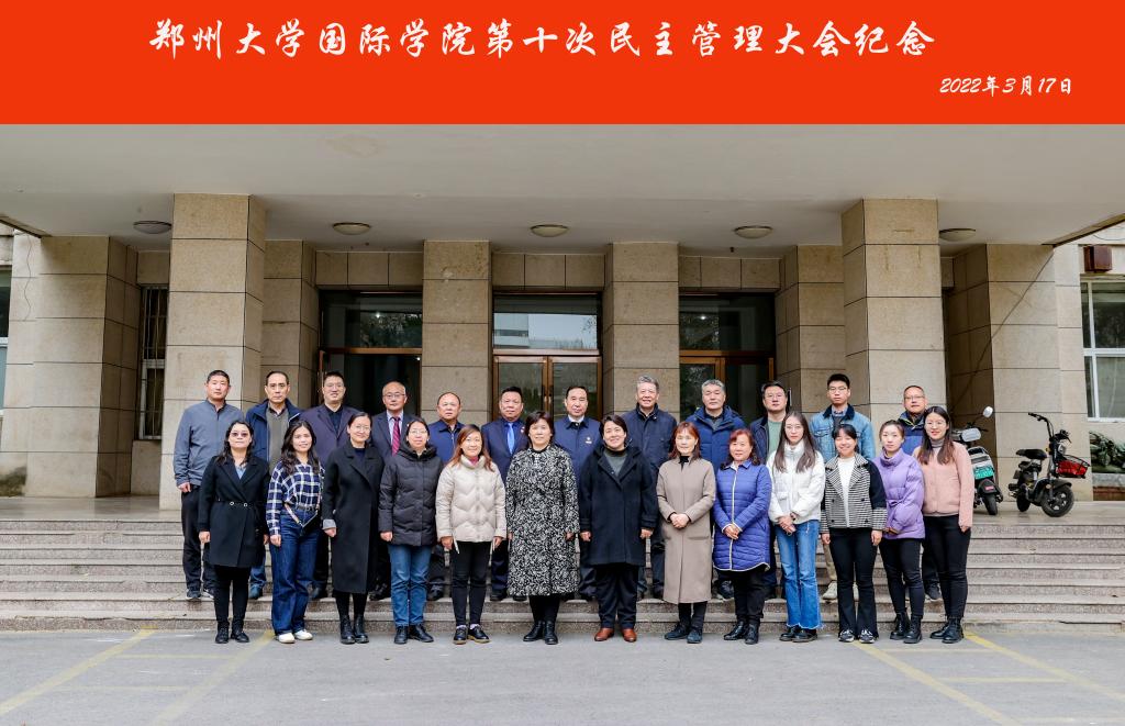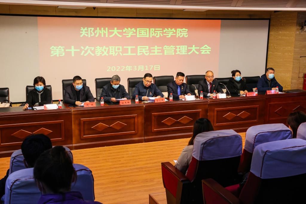 为保障我院教职工民主监督权利,推进学院民主管理进程,有效促进学院发展,2022年3月17日下午,郑州大学国际学院第十次教职工民主管理大会以线上线下相结合的方式召开。学院全体教职工参加了会议,教职工代表在郑州大学南校区14号楼201参会,其余教职工参加线上腾讯会议。会议由国际学院党委副书记、工会主席吴军超主持。