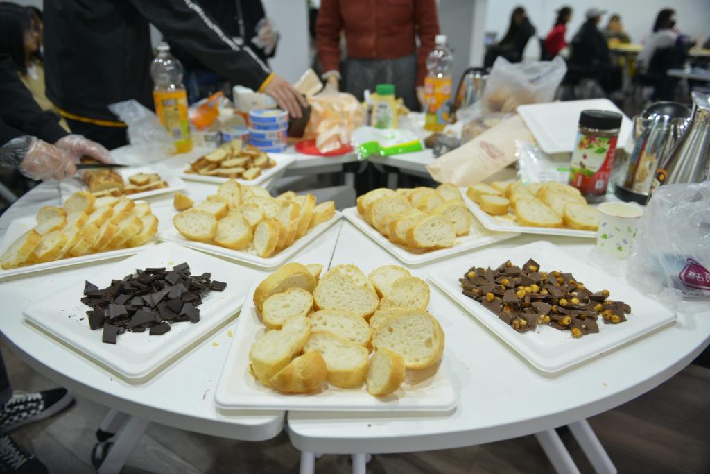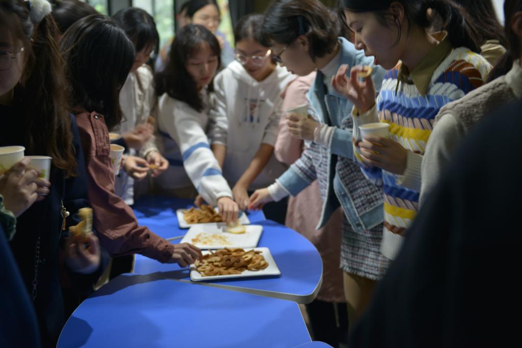 该活动分为法国美食介绍和美食品尝两个环节。中法电影学院李艳锦老师首先介绍法国美食的历史和特点,讲解法餐的组成及代表食物,帮助学生更好地体会法国美食文化。之后,参与学生被分为几组,品尝了具有法国特色的巧克力、法棍、咖啡、奶酪和可颂面包等美食。