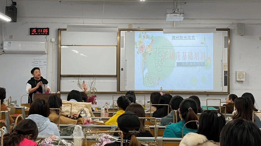 本次活动邀请了中原花木交易博览会花艺大赛金奖获得者崔春先生为大家进行培训。首先,崔先生用PPT为大家讲授《插花基础培训》知识,让大家对插花艺术的发展、花材特点、插花分类、器皿选择、色彩搭配等有了初步的了解;接着,进入实战插花环节,女教工们情绪高涨,在花艺老师的悉心指导下,拿起事先准备好的当季鲜花、剪刀、器皿等插花工具,发挥各自想象力,按照插花艺术基本技巧,将多姿多彩的鲜花按层次搭配在一起,创作出自己心仪的花艺作品;最后,大家纷纷手捧精美花篮展示自己的作品,分享喜悦的心情。
