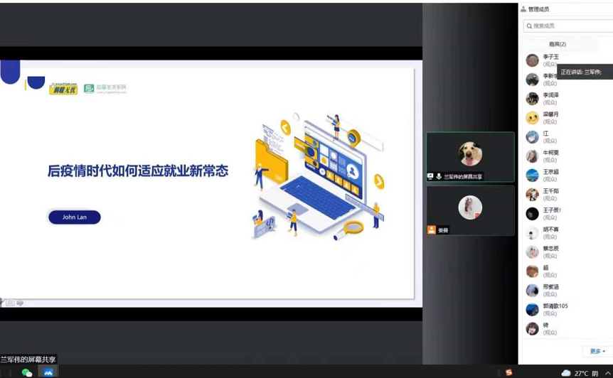 4月26日下午三点,第一期沙龙特邀职业发展规划师、前程无忧职前教育平台“职前学院”创办人之一的兰军伟老师作为嘉宾,以腾讯会议直播的方式,与大家分享“后疫情时代如何适应就业新常态”。