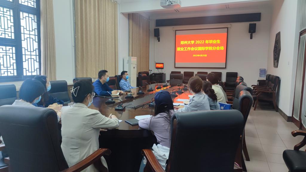 为深入贯彻教育部2022届全国普通高校毕业生就业工作第三次调度视频会议精神,4月25日下午,郑州大学召开了2022年毕业生就业工作会议。国际学院党委书记安立民现场参会,院长陈思坤、院党委副书记赵强、就业办公室老师以及2022届辅导员老师在国际学院分会场以线上形式参会。