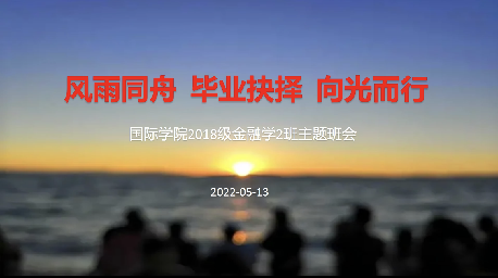 5月13日晚,我院18级金融2班班主任李祺老师为同学们召开了一场“云端”就业主题班会,详细介绍了学院近年来毕业生去向、就业单位行业分布情况,并通过典型案例教导同学们要结合自身特点,静心思考职业规划,提前做好打算,选择最适合自己的人生路径。针对疫情形势发展状况,鼓励同学们要韬光养晦,多读书,勤思考,遵守学校和学院的防疫规定,放平心态,充分利用好大学最后的美好时光。