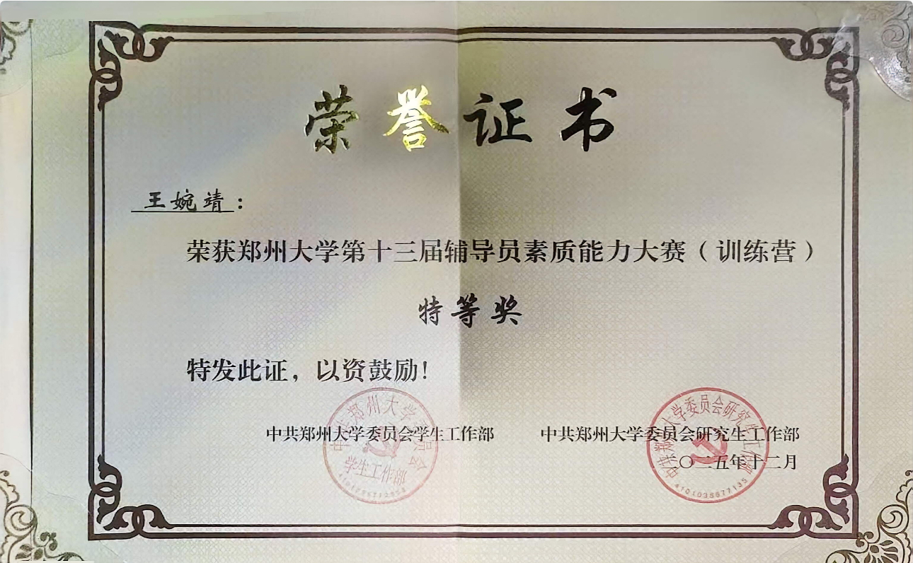 图2.我院王婉靖老师荣获郑州大学第十三届辅导员素质能力大赛(训练营)特等奖