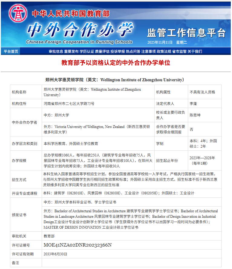 11 月 9 日,郑州大学惠灵顿学院申请新增的硕士层次工业设计专业正式获得教育部批复。该专业的成功获批,标志着学院中外合作办学实现了从本科到硕士层次的历史性跨越,是学院国际化办学进程中具有里程碑意义的重要成果,也是在学校与新西兰惠灵顿维多利亚大学成功共建惠灵顿学院基础上的深化与拓展。