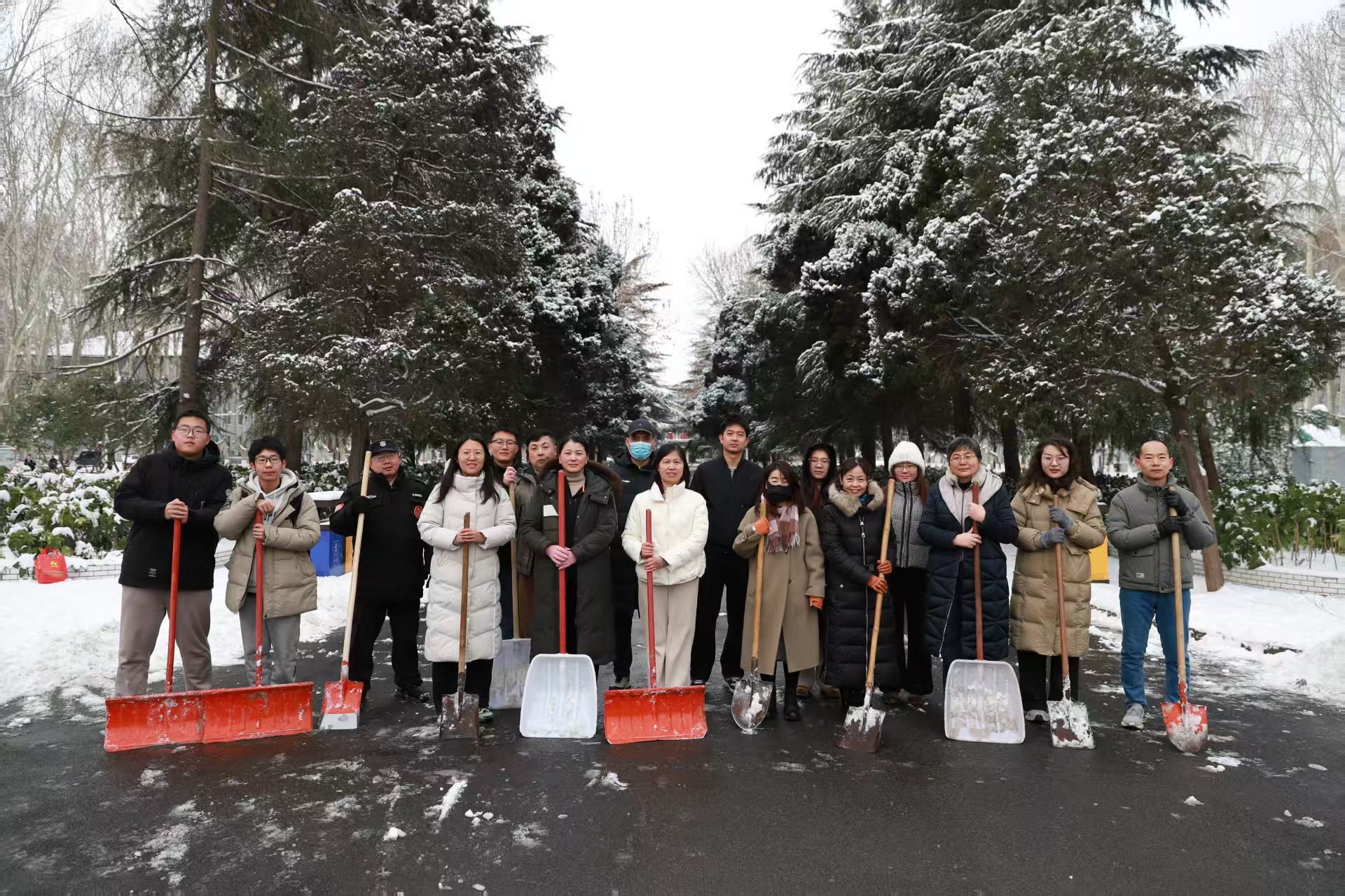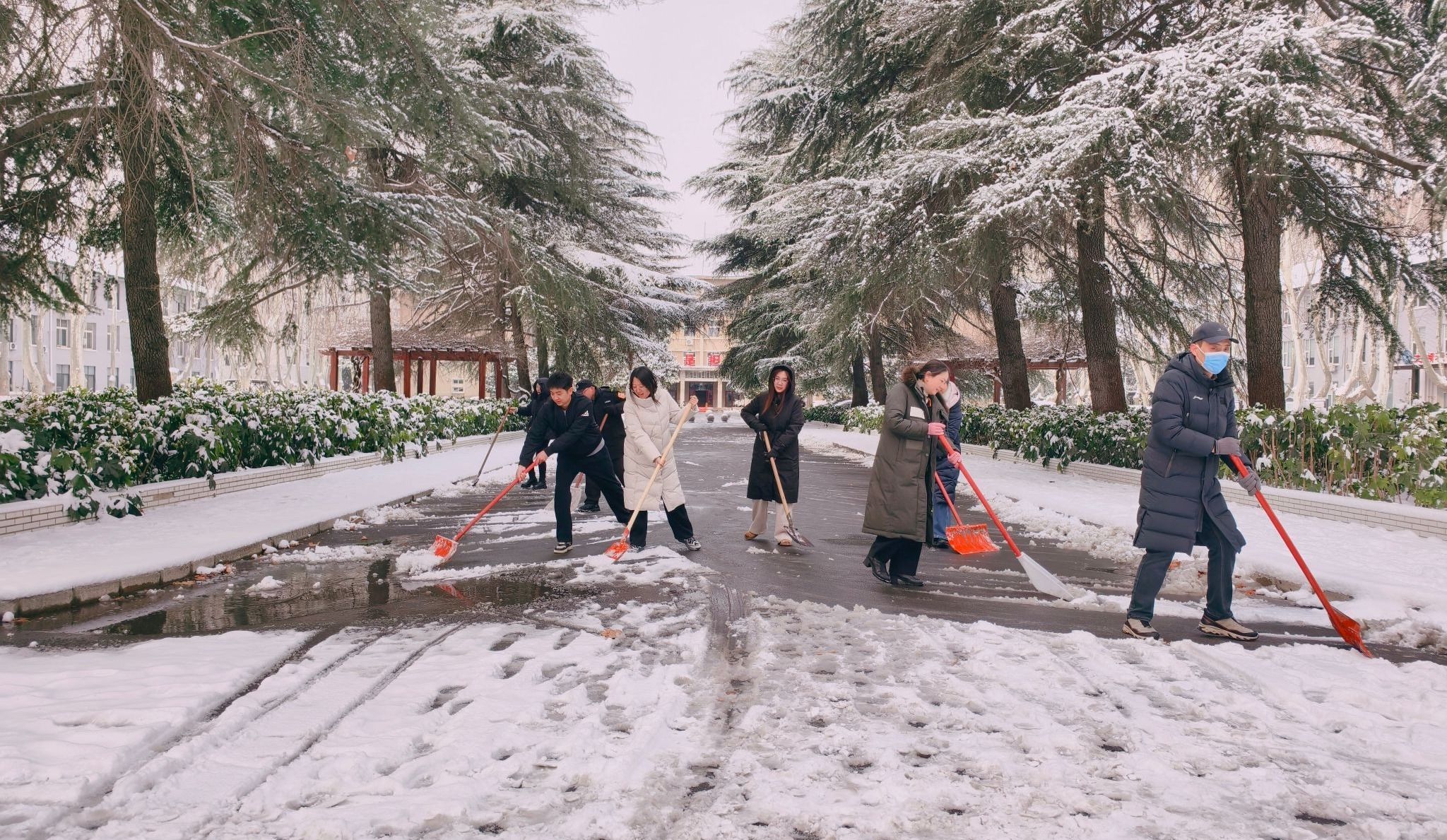 在清雪行动中,学院教职工不畏严寒,手持铁锹、雪铲等工具,分工协作、默契配合,重点对办公楼前、人行主次干道等师生通行密集区域进行集中清理。行动期间,党员教职工切实发挥带头作用,以实际行动践行责任担当。经过数小时的努力,相关区域的路面积雪与暗冰得到有效清除,行人通道恢复安全畅通。