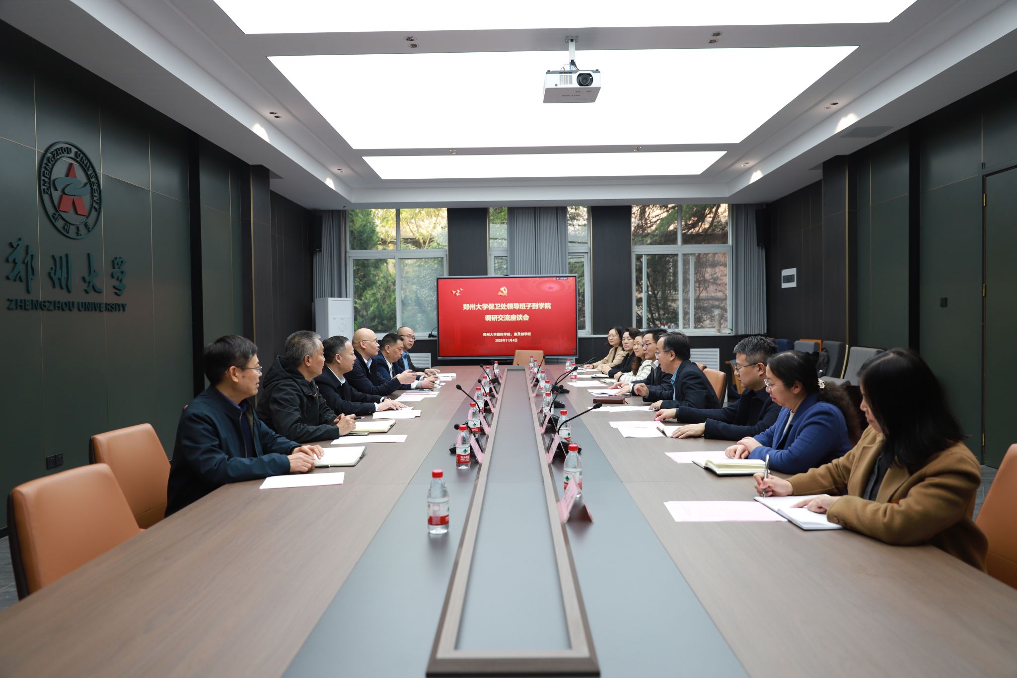 11月4日下午,郑州大学保卫处一行到国际学院、惠灵顿学院进行调研座谈,座谈会在教1楼第一会议室举行。郑州大学保卫处党总支书记郭文理、处长张凯、党总支副书记张加富、副处长滕海昕、徐大友、余海涛出席会议;国际学院、惠灵顿学院党委书记何建强,党委副书记、纪委书记庄琼琼,党委副书记兼学校国际交流与合作处副处长谢亚新,副院长余义芳、宋红生、贾晓燕以及学院党政办公室相关负责人参会。会议由国际学院、惠灵顿学院执行院长、党委副书记刘永杰主持。