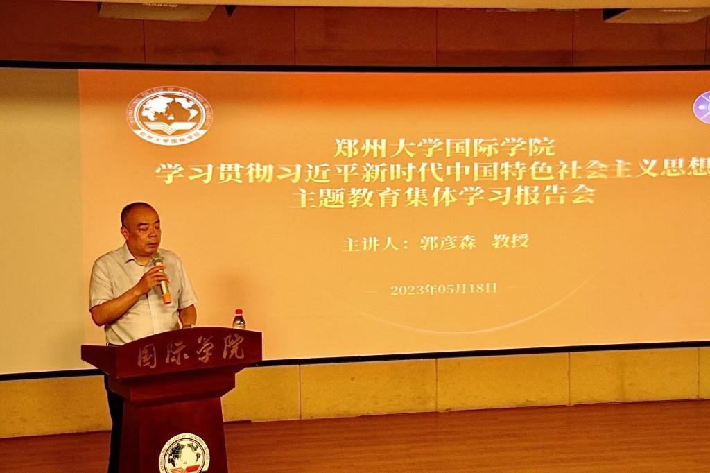 5月18日下午,国际学院在14号楼201教室召开学习贯彻习近平新时代中国特色社会主义思想主题教育集体学习报告会。郑州大学马克思主义学院教授郭彦森以《习近平新时代中国特色社会主义思想的几个重要理论问题》为题,为我院200余名党员教工、学生作专题报告。本次报告会由院党委书记李华峰主持。