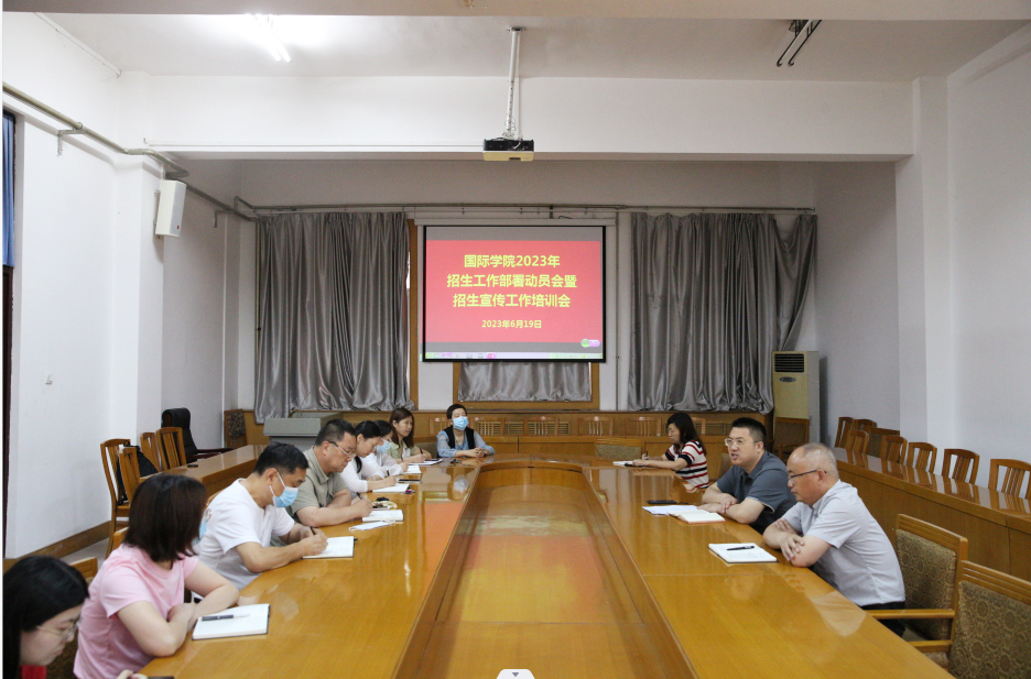 6月19日上午,我院在行政楼第一会议室召开国际学院2023年招生工作部署动员会暨招生宣传工作培训会,学院党委副书记吴军超、学院全体招生咨询老师及招生与就业指导办公室工作人员参加了此次会议。会议由学院党委副书记赵强主持。