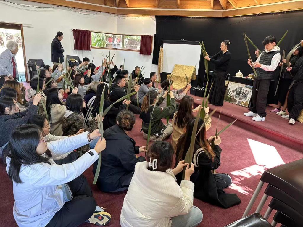 学习之余,项目还组织学生欣赏海景、乘坐渡轮、徒步海边、攀登火山、感受法式早市等人文景观活动,并在研学期间有幸邀请到了新西兰推动毛利文化的先驱者,获得新西兰英女皇服务勋章、首届国际潮人文学奖、增进中纽文化交流奖以及海外优秀华文教育工作者林爽老师。林爽老师从毛利人与中国人基因的相似渊源为出发点,逐步引申毛利人的文化习俗,纹身传统。此外,毛利部落酋长用毛利特有的欢迎仪式和欢送仪式接待了同学们。同学们通过跟随毛利人学习毛利的甩球舞、制作草编花、品尝毛利食物等方式感受了毛利的多彩传统文化。
