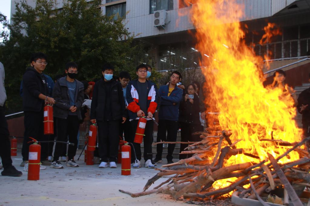 消防演练结束后,王欢教员为师生讲解并示范了消防灭火器的正确使用步骤和方法。我院为学生提前准备了30余个灭火器,在教员和学院辅导员老师的指导下依次按照规范动作参与了灭火器的实际操作演练。