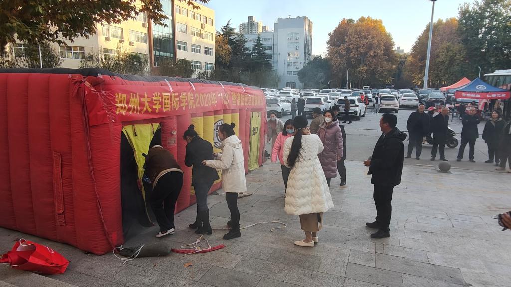 会后,在南校园图书馆楼前组织学生进行了消防疏散逃生演练。参加培训的师生用湿毛巾捂住口鼻,依次进入提前准备好的漆黑的消防逃生疏散体验屋内,屋内环境模拟烟雾缭绕的真实火场环境,师生需要依据所学消防标识才能寻找到正确的“逃生”出口。演练活动全程紧张有序,以练促防,达到了理想的学习体验效果。